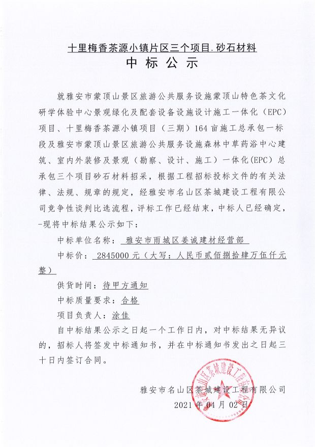 十里梅香茶源小鎮(zhèn)片區(qū)三個(gè)項(xiàng)目砂石材料中標(biāo)公示