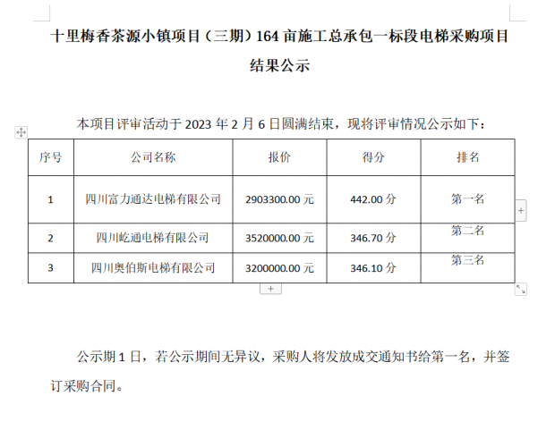十里梅香茶源小鎮(zhèn)項目(三期)164畝施工總承包一標段電梯采購項目 結(jié)果公示